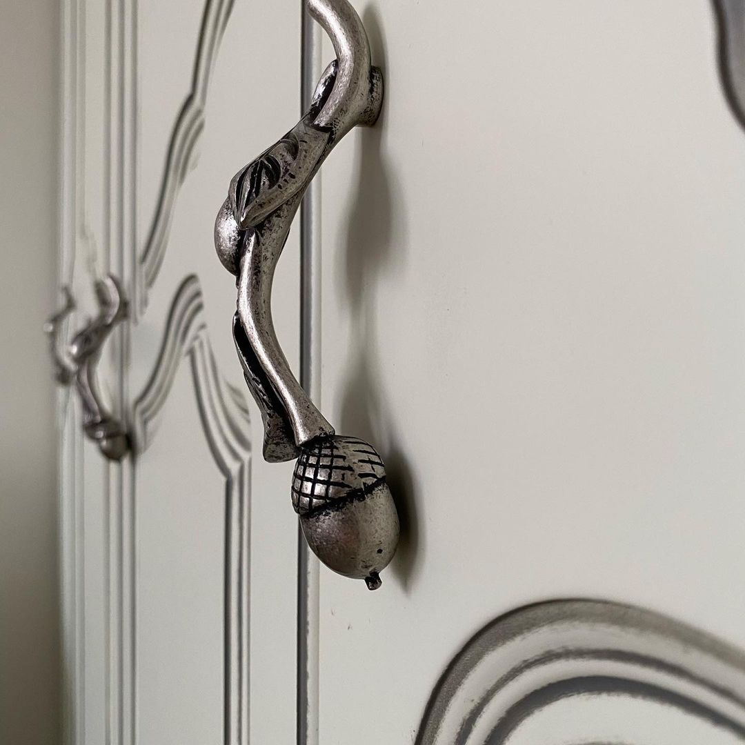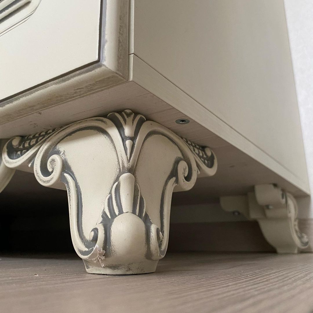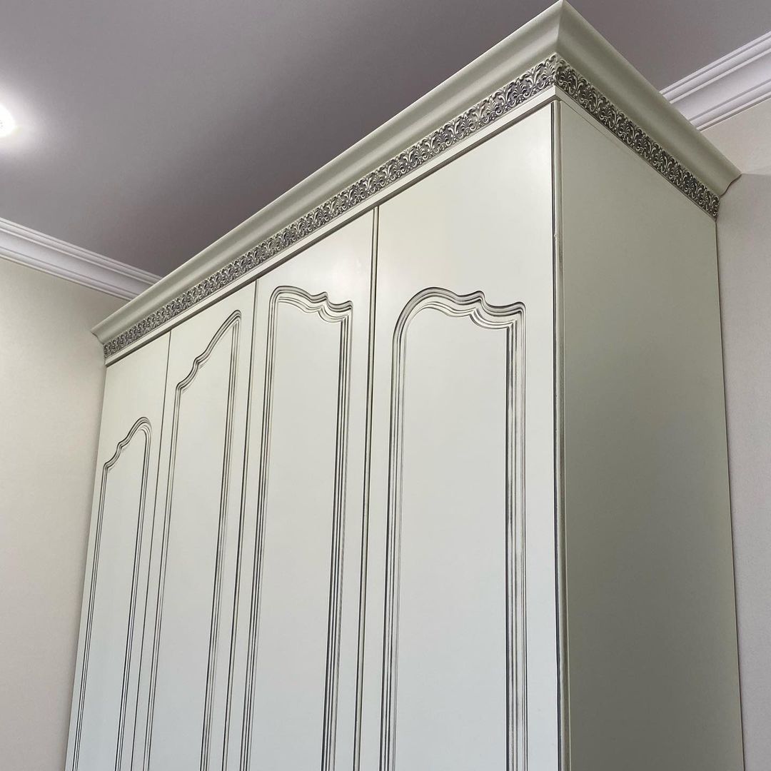Гардеробный шкаф выполнен в классическом стиле с применением матовой отделки МДФ полиуретановым грунтом FL C499/C02, полиуретановой эмалью FO 25M060, медной патиной GM M060, а также матовым акриловым лаком JO 10M379.