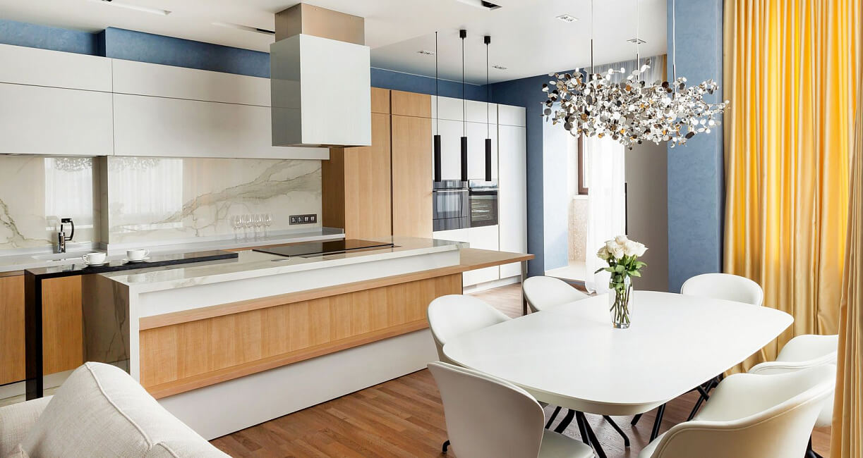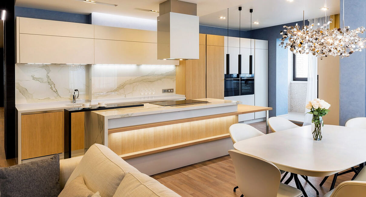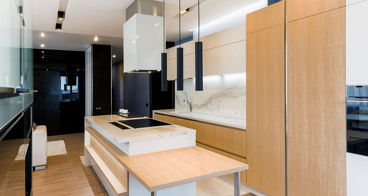 Кухня с островом в стиле Industrial, выполненная под заказ от компании Giulia Novars. Кухня изготовлена из натурального шпона дуба и покрыта новой полиуретановой матовой эмалью FO xxC580. Основными преимуществами данной эмали являются: