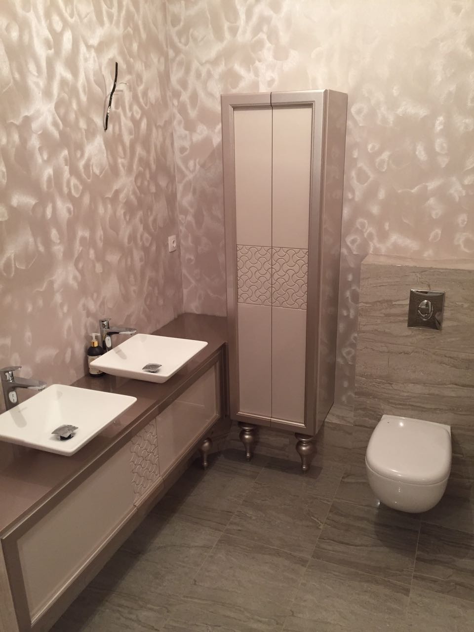 Мебель для ванной комнаты в современном стиле, выполненная под заказ от компании Ла Куалита. Мебель изготовлена из МДФ с нанесением полиуретанового грунта FL R850 и полиуретановой эмали FO 25R810. На финише нанесен глянцевый акриловый лак JB R970. Основными преимуществами грунта FL R850 являются: