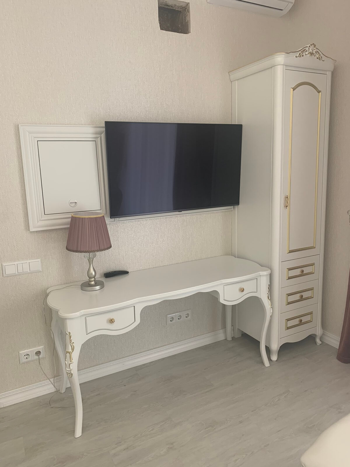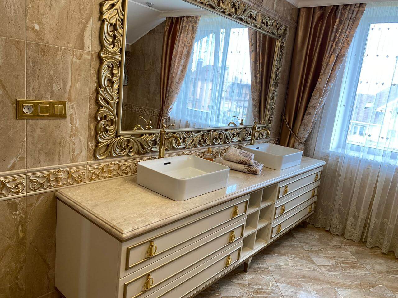 Зеркало в ванной комнате выполнено из МДФ с применением матовой полиуретановой эмали FO 25R810 и нанесением золотой патины. Тумба выполнена по той же технологии, что и кухня.