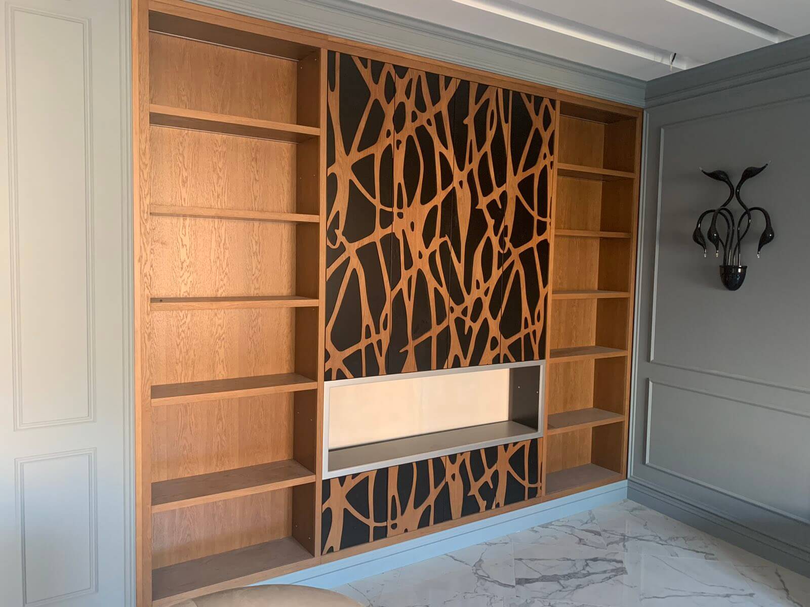 Шкаф в гостиной комнате выполнен из МДФ шпона дуба с применением самогрунтующегося лака.