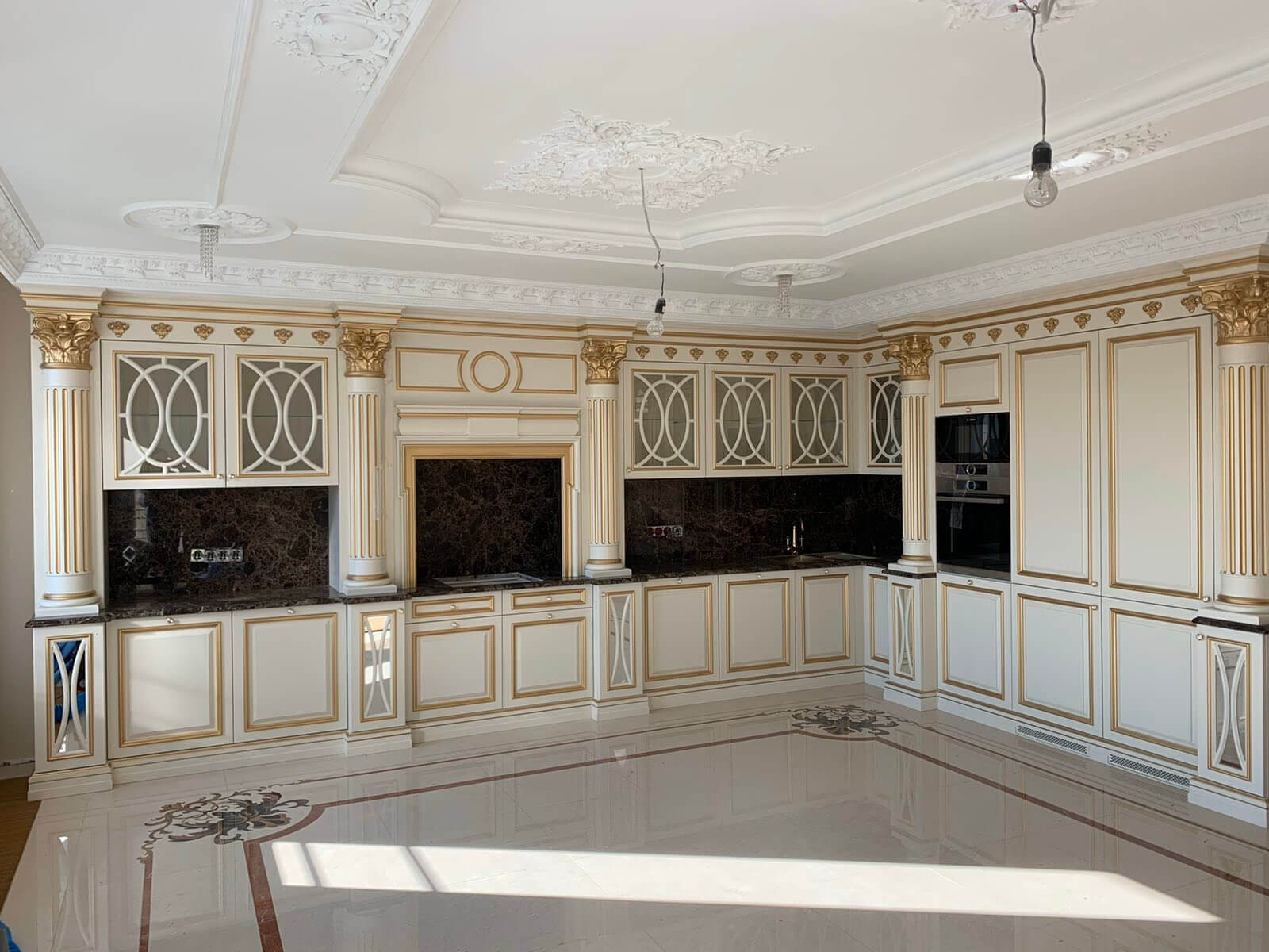 Кухня изготовлена из МДФ с матовой пигментной отделкой с применением матовой полиуретановой эмали FO 25R810 и матового лака JO 25R510. Также сверху нанесена золотая патина JMM048, превосходно подчеркивающая поры в эффекте декапе. Основными преимуществами эмали FO 25R810 являются: