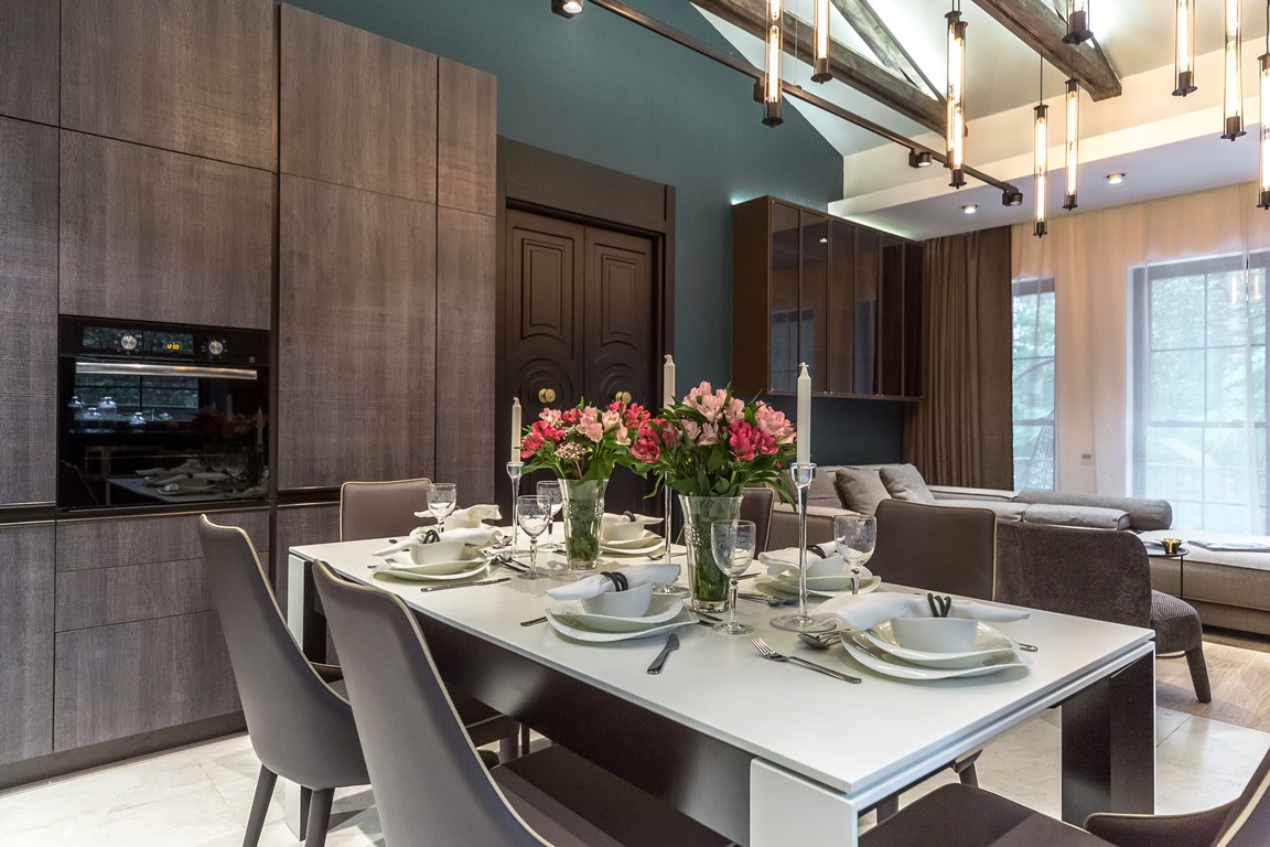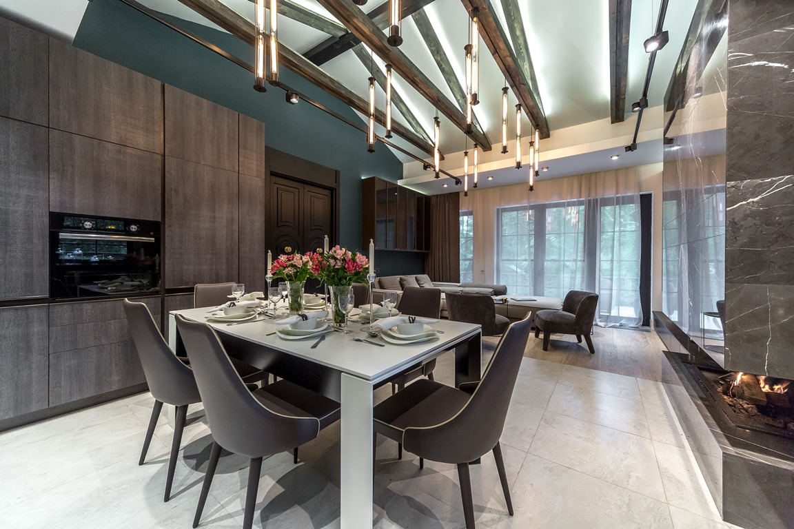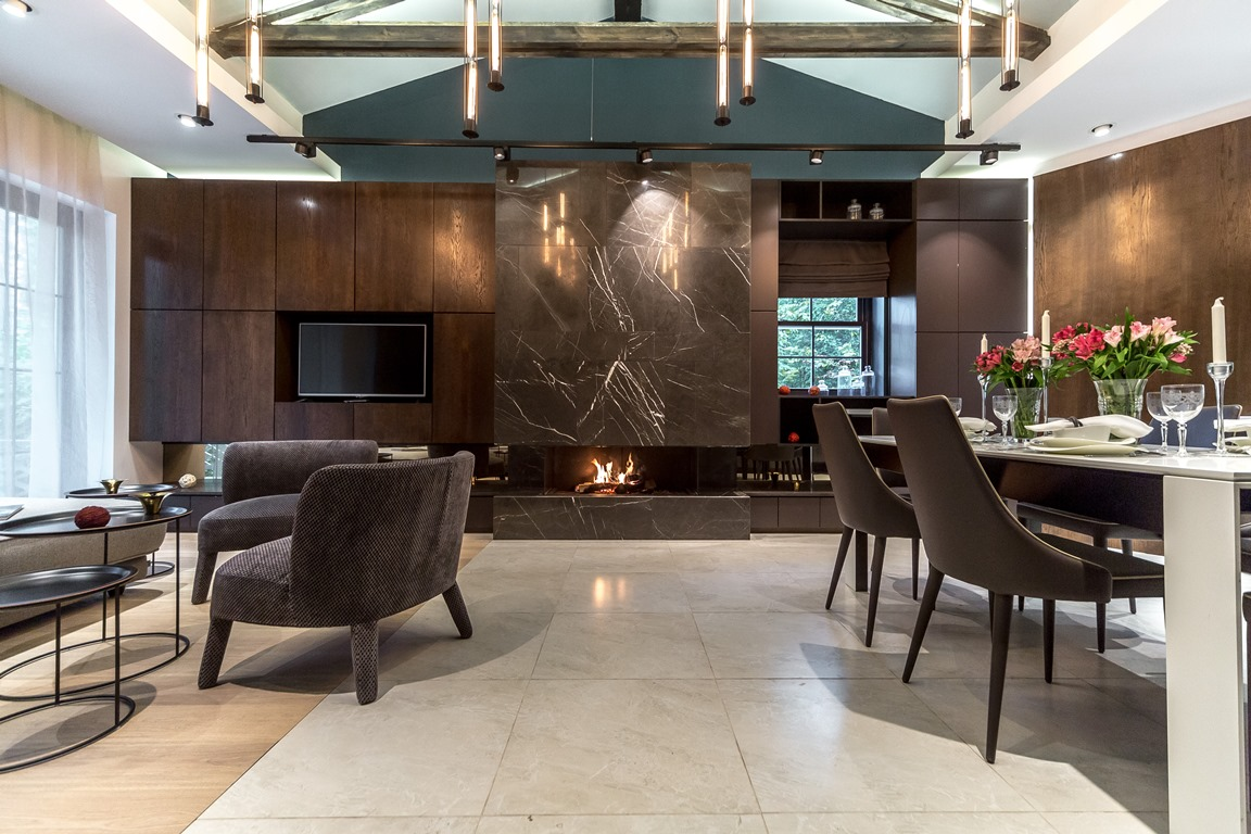 В передаче «Дачный ответ» обычную кухню в частном доме перестроили в величественную парадную гостиную в английском стиле. Материалами Renner отделаны стол и стулья, а так же фасады и полки мебельной композиции около ТВ.