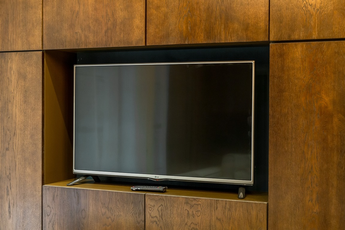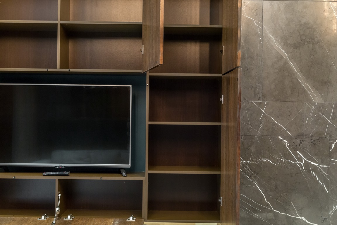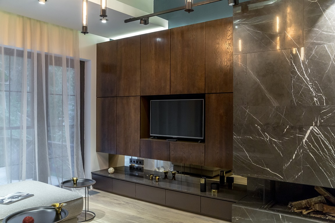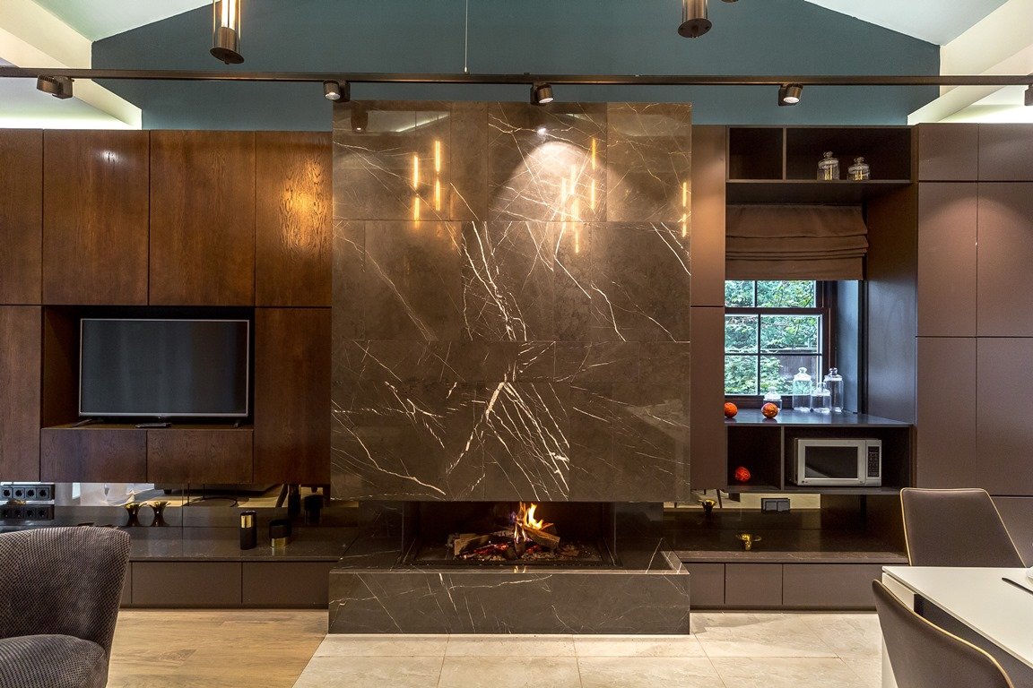 В передаче «Дачный ответ» обычную кухню в частном доме перестроили в величественную парадную гостиную в английском стиле. Материалами Renner отделаны стол и стулья, а так же фасады и полки мебельной композиции около ТВ.