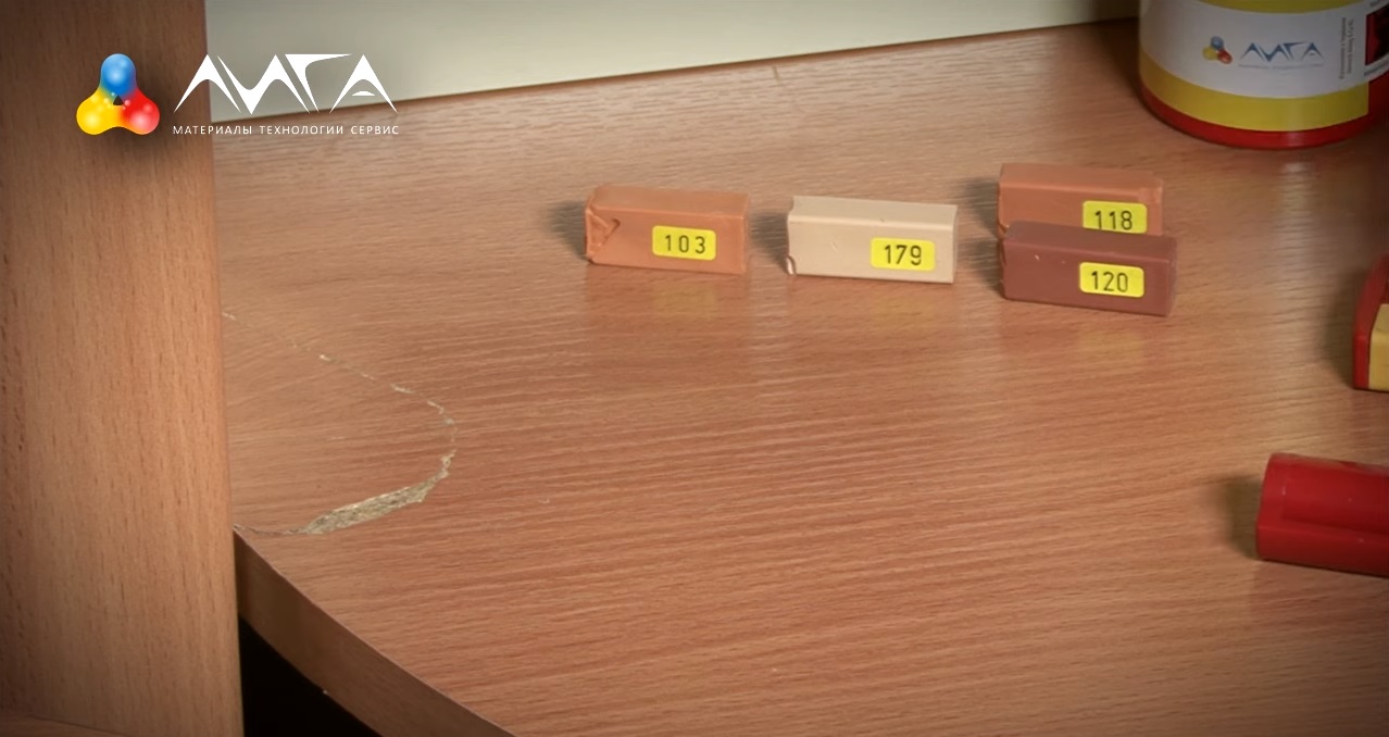 Скол на ламинированном ДСП устраняет технический директор по реставрационным материалам König компании "ЛИГА" - Виталий Ганичкин.